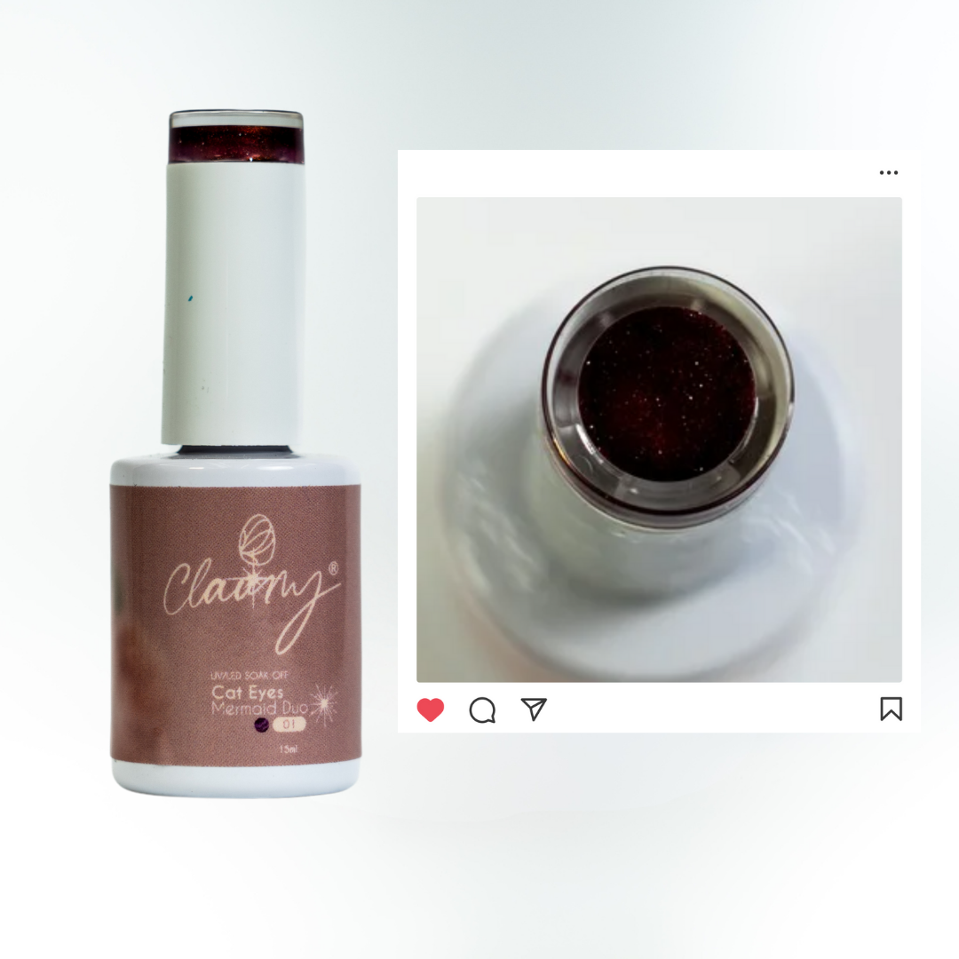 Descubre el poder del magnetismo con la nueva colección Cat Eyes Mermaid Duo de Claumy. Diez tonos intensos con acabados dúo cromo que cambian con la luz y el movimiento, generando un efecto “ojo de gato” profundo y mágico. Esta línea de esmaltes semipermanentes ha sido creada para quienes buscan un diseño llamativo, elegante y en tendencia.
