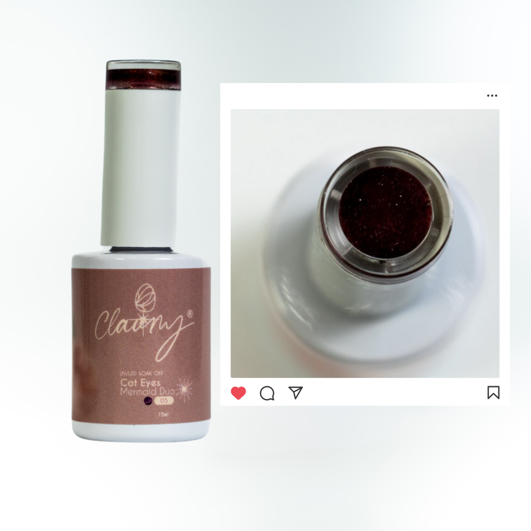 Descubre el poder del magnetismo con la nueva colección Cat Eyes Mermaid Duo de Claumy. Diez tonos intensos con acabados dúo cromo que cambian con la luz y el movimiento, generando un efecto “ojo de gato” profundo y mágico. Esta línea de esmaltes semipermanentes ha sido creada para quienes buscan un diseño llamativo, elegante y en tendencia.
