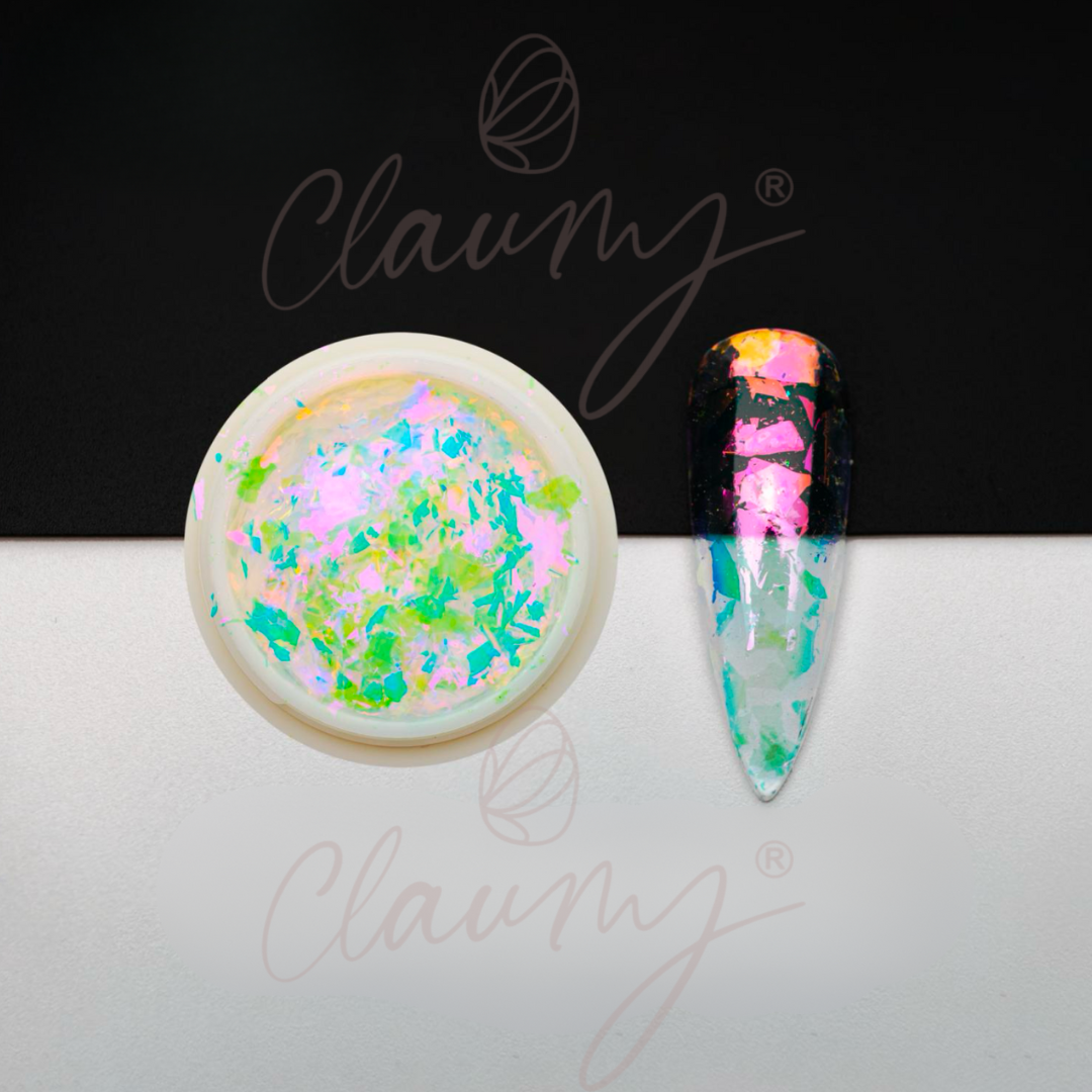 Elevate your style with Claumy Azurita Flakes , which offer a vibrant deep blue with electric reflections. These Flakes are perfect for adding a dramatic and artistic touch to your nails, providing a unique texture and an unmistakable shine. Ideal for evening events and parties, they add a touch of mystery and sophistication to any look.