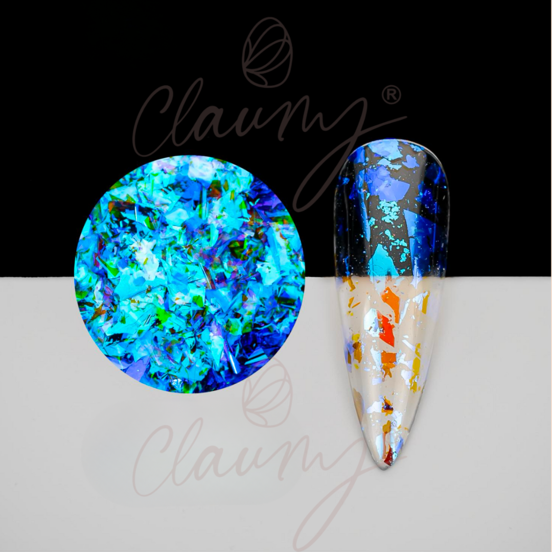 Elevate your style with Claumy Azurita Flakes , which offer a vibrant deep blue with electric reflections. These Flakes are perfect for adding a dramatic and artistic touch to your nails, providing a unique texture and an unmistakable shine. Ideal for evening events and parties, they add a touch of mystery and sophistication to any look.