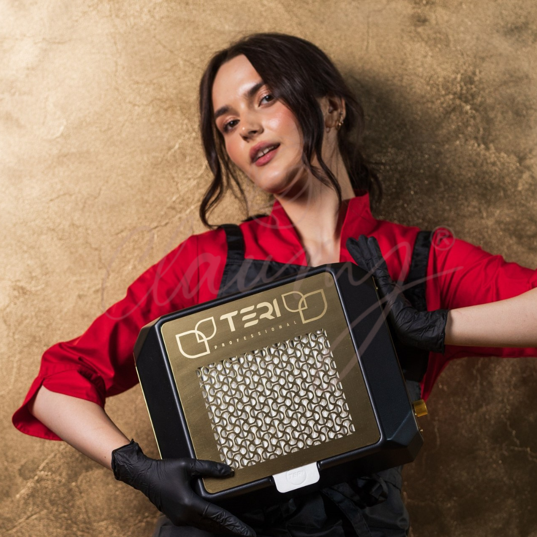 El Teri Diamond 90W es un aspirador profesional de sobremesa para manicura con diseño compacto, potencia extrema y un acabado premium en dorado y negro(tenemos variedades de colores REJILLA-DORADA,PLATA; PLASTICO-NEGRO,BLANCO) que eleva la estética de cualquier mesa de trabajo. Gracias a su filtro HEPA lavable, este aspirador garantiza una purificación del aire del 100 %, protegiendo tanto la salud del manicurista como la del cliente.