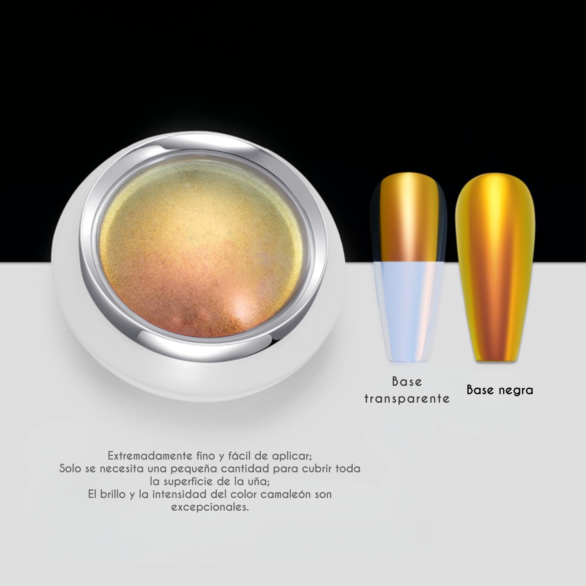 El Aurora Chameleon AP0502 es un pigmento camaleón de alto impacto que transforma cualquier diseño en un reflejo líquido de luz. Su fusión de tonos dorados intensos con matices cálidos y destellos metálicos crea un efecto espejo irresistible, ideal para quienes buscan una manicura elegante, llamativa y con un acabado premium.
